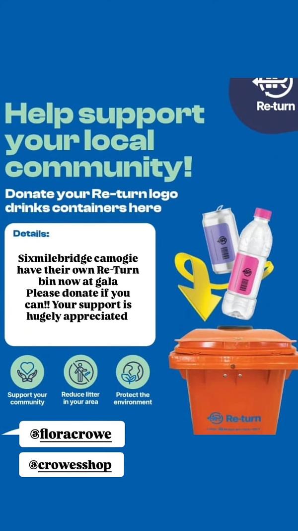 The Sixmilebridge Camogie Club have placed a Re-Turn bin outside of Gala. Please donate if you can. Along with the Hurling Club we aim to raise funds towards the day to day running of the club as a whole and clean up our community along the way.